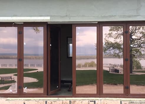 Выполненные работы: Установлено 16 панорамных окон, Ламинация изделий под дерево, профильная система REHAU Delight и Brillant, Остекление 6 входных групп, Противовзломная фурнитура Siegenia Titan AF, Стеклопакет 40 мм с i-стеклом
